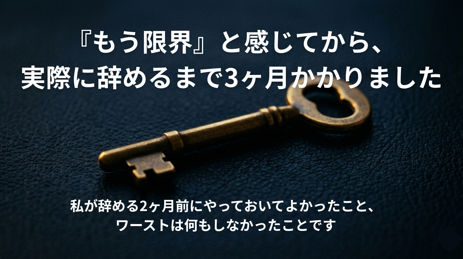 準備とは、体力の温存でもあります。辞める前後の数ヶ月は、精神的に一番消耗します。その時期に「なにも用意していなかった」という状態にならないために、今動いておく必要があります。