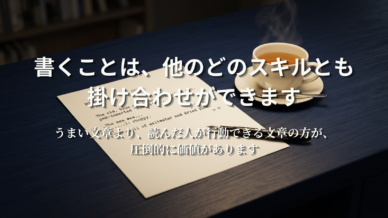 地味なスキル Webライティングは「文章が得意な人」じゃなくていい。40代が副業で月3〜5万円稼ぐための、地味で正直な入門 「文才がないから無理」と思っていませんか。Webライティングに必要なのは文才ではなく「構成力」と「調べる力」です。40代からの副業として現実的な始め方を書いています。 2026.04.24 地味なスキル